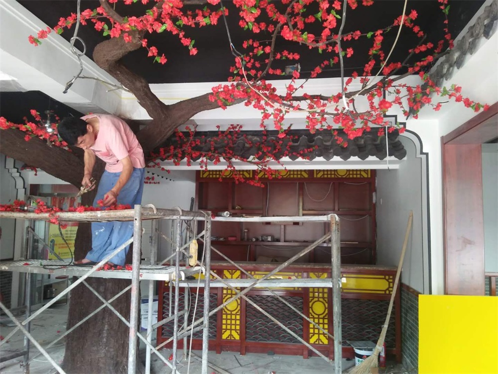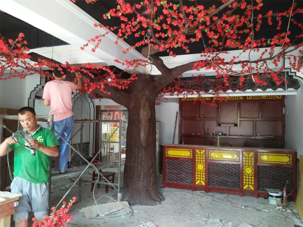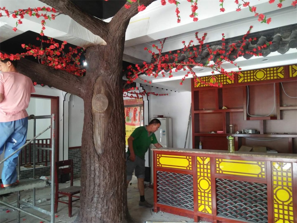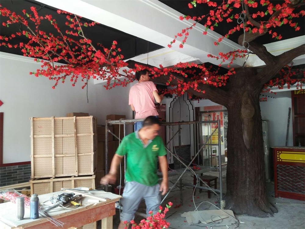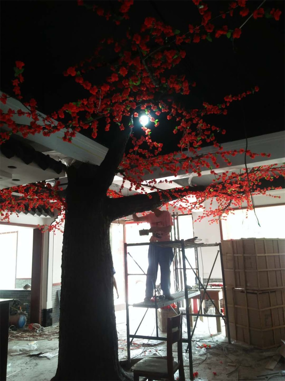 項(xiàng)目說(shuō)明:假樹的樹干及主要枝干采用水泥直塑成型,樹葉和花采用絹布仿真花葉工藝。整體高度3米,樹冠直徑4.5米。