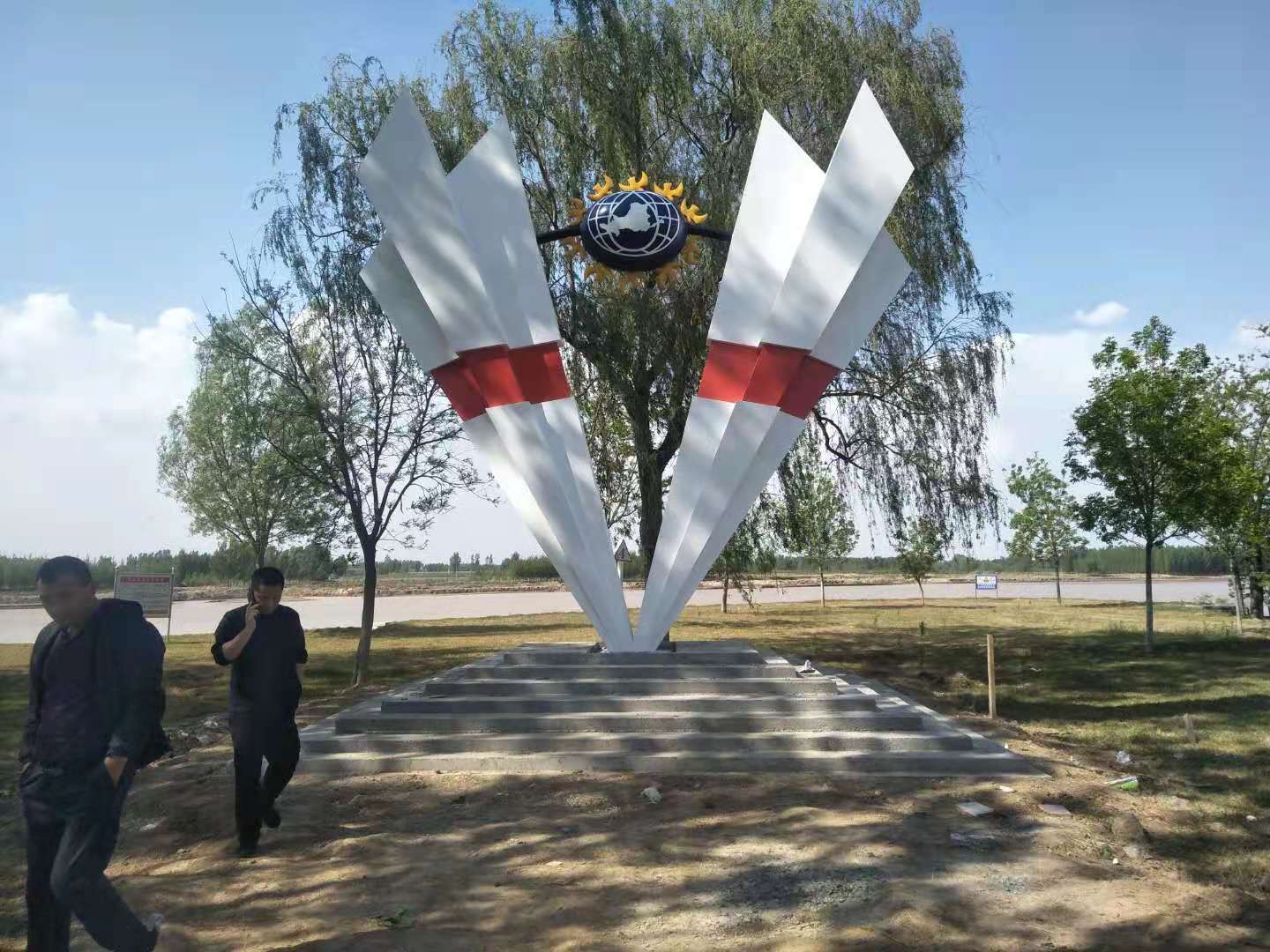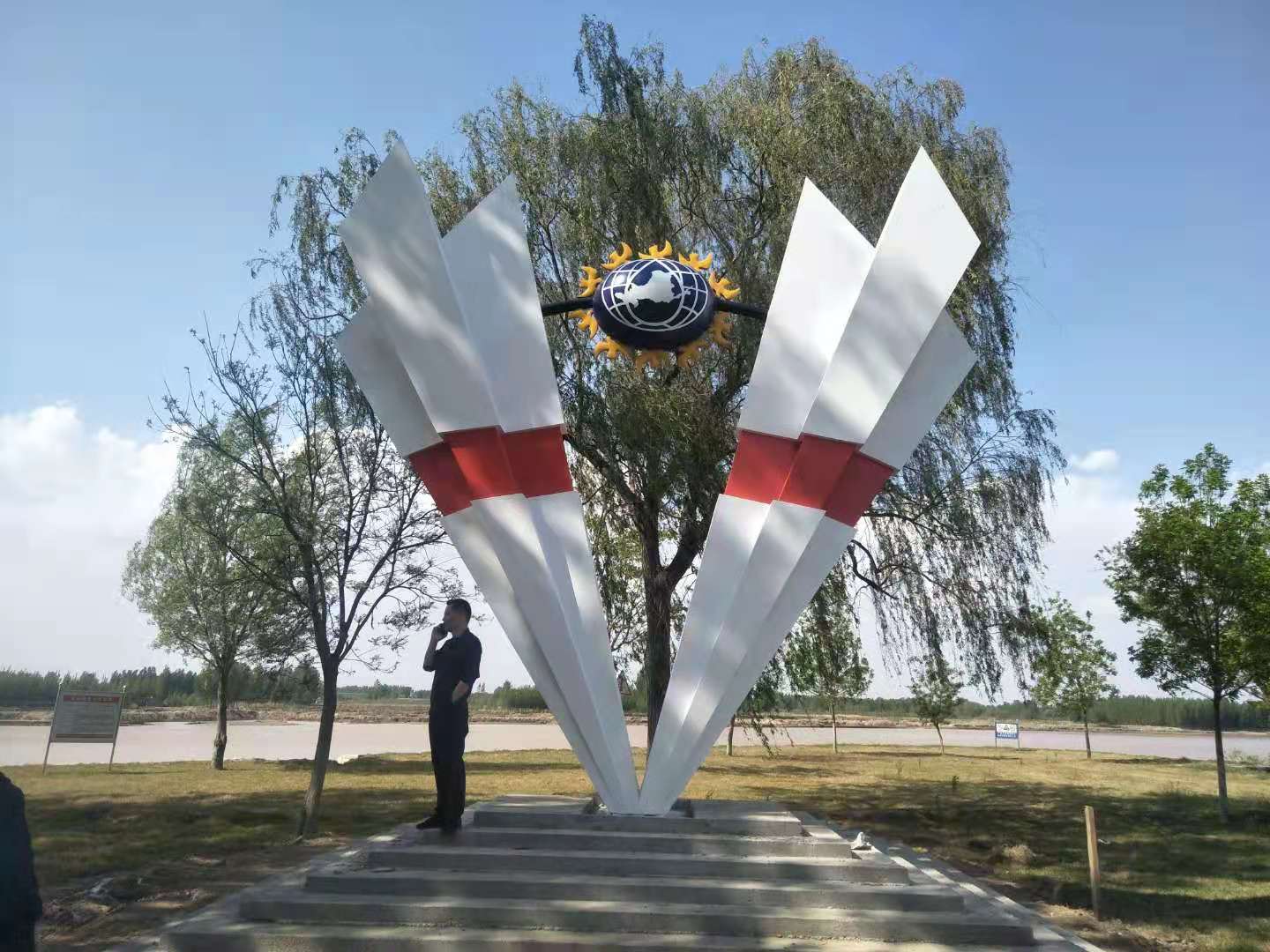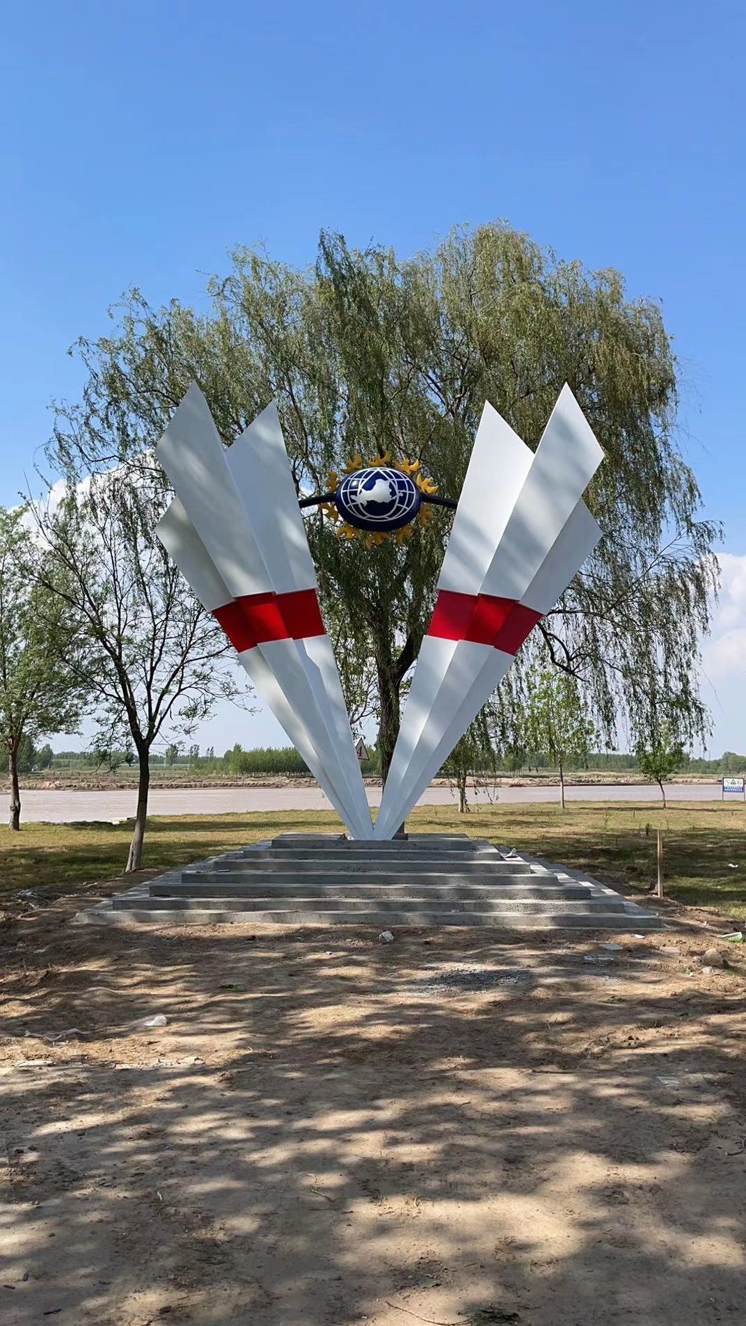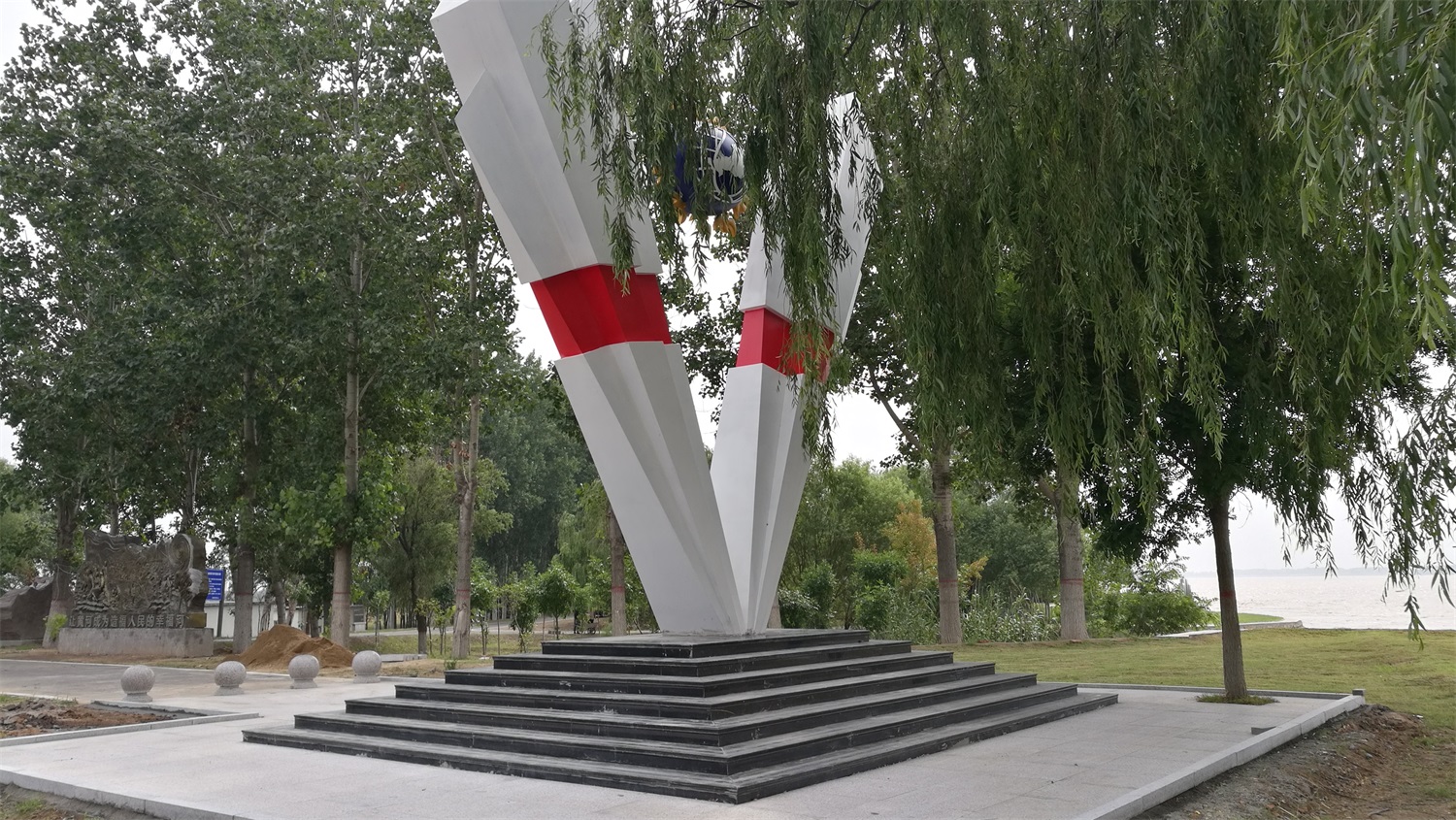 雕塑整體呈扇形構(gòu)造,代表黃河三角洲扇形外貌;兩側(cè)形似利劍,寓意治黃工作者敢于“亮劍”的拼搏精神; 中間球形,寓頂點(diǎn)之意;其上印制有黃河水利委員會(huì)標(biāo)志,圍繞十只和平鴿。寓意以治黃事業(yè)為中心、人民幸福、和平安寧、生態(tài)保護(hù)、空間均衡;主體色彩以紅、黃、藍(lán)搭配。紅色代表黨建引領(lǐng),黃、藍(lán)象征海河交匯。寓意治黃事業(yè)在中國(guó)共產(chǎn)領(lǐng)導(dǎo)下開創(chuàng)新篇章。