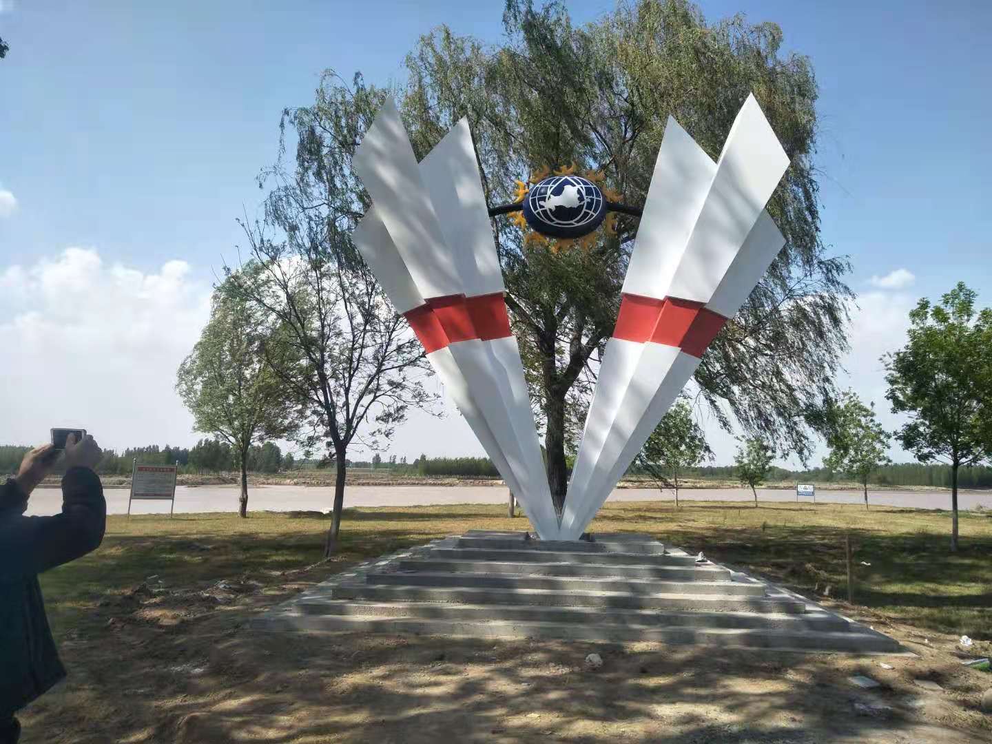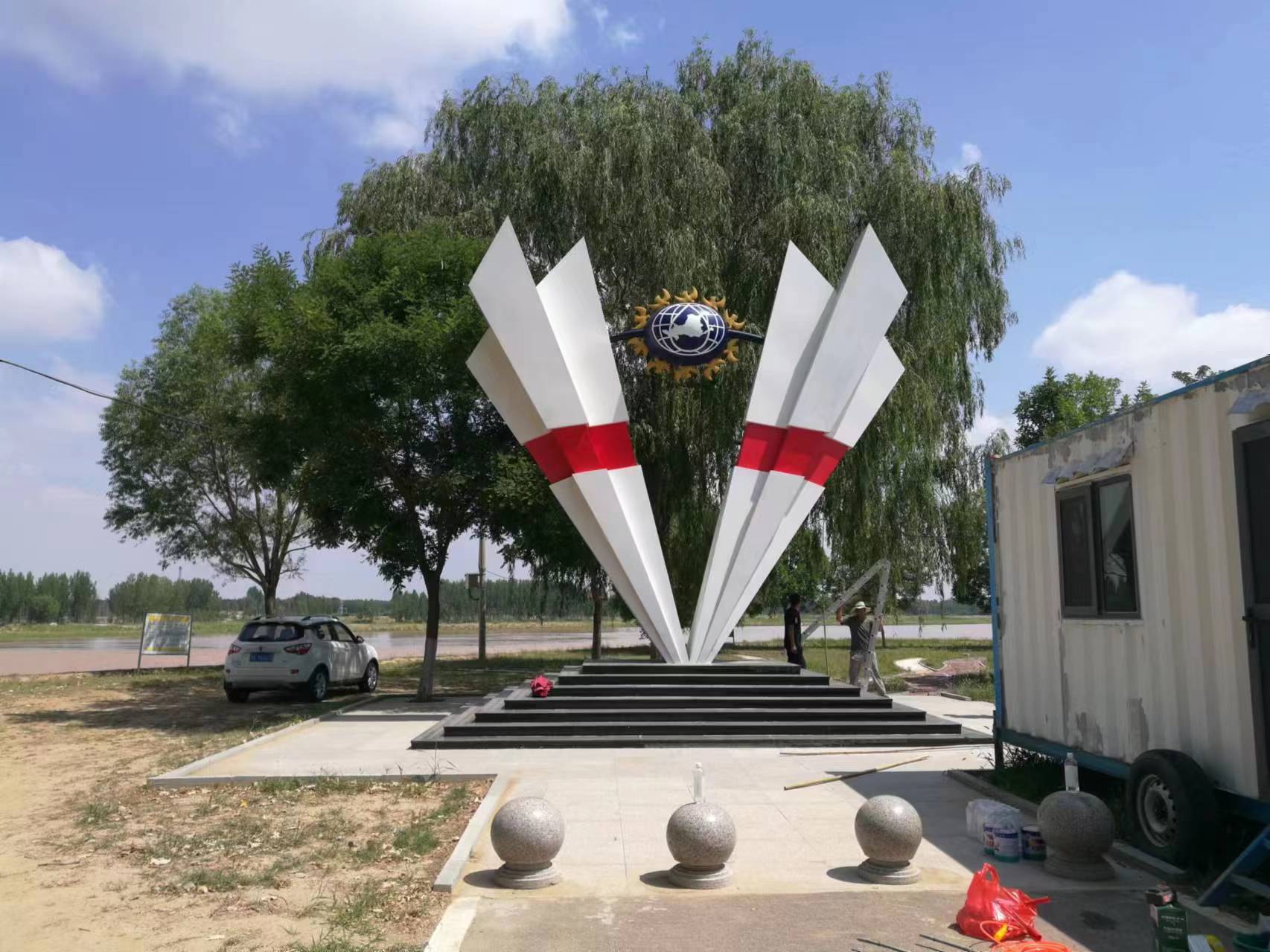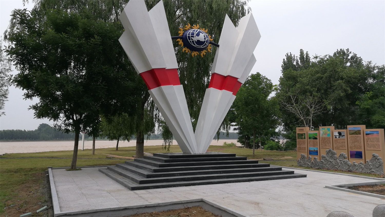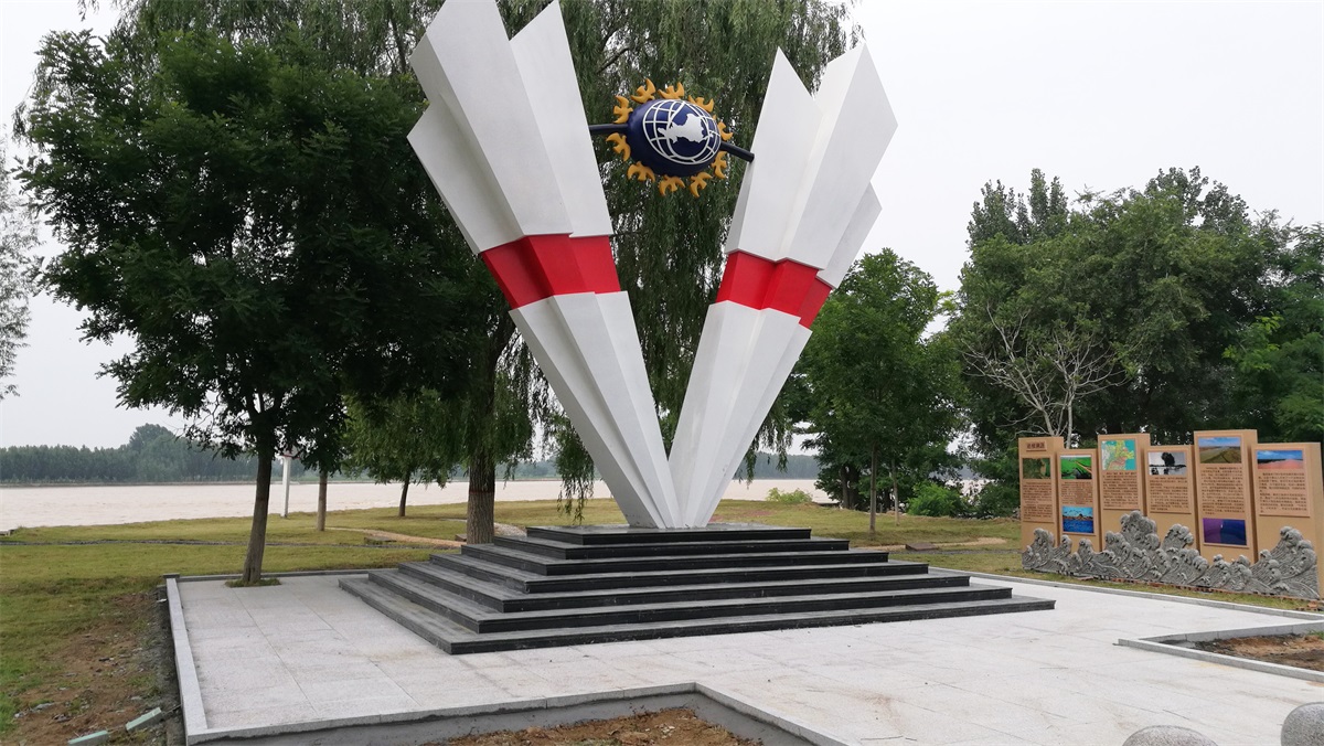 雕塑整體呈扇形構(gòu)造,代表黃河三角洲扇形外貌;兩側(cè)形似利劍,寓意治黃工作者敢于“亮劍”的拼搏精神; 中間球形,寓頂點(diǎn)之意;其上印制有黃河水利委員會(huì)標(biāo)志,圍繞十只和平鴿。寓意以治黃事業(yè)為中心、人民幸福、和平安寧、生態(tài)保護(hù)、空間均衡;主體色彩以紅、黃、藍(lán)搭配。紅色代表黨建引領(lǐng),黃、藍(lán)象征海河交匯。寓意治黃事業(yè)在中國(guó)共產(chǎn)領(lǐng)導(dǎo)下開創(chuàng)新篇章。