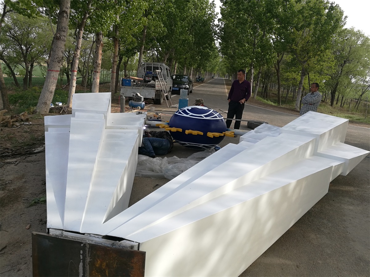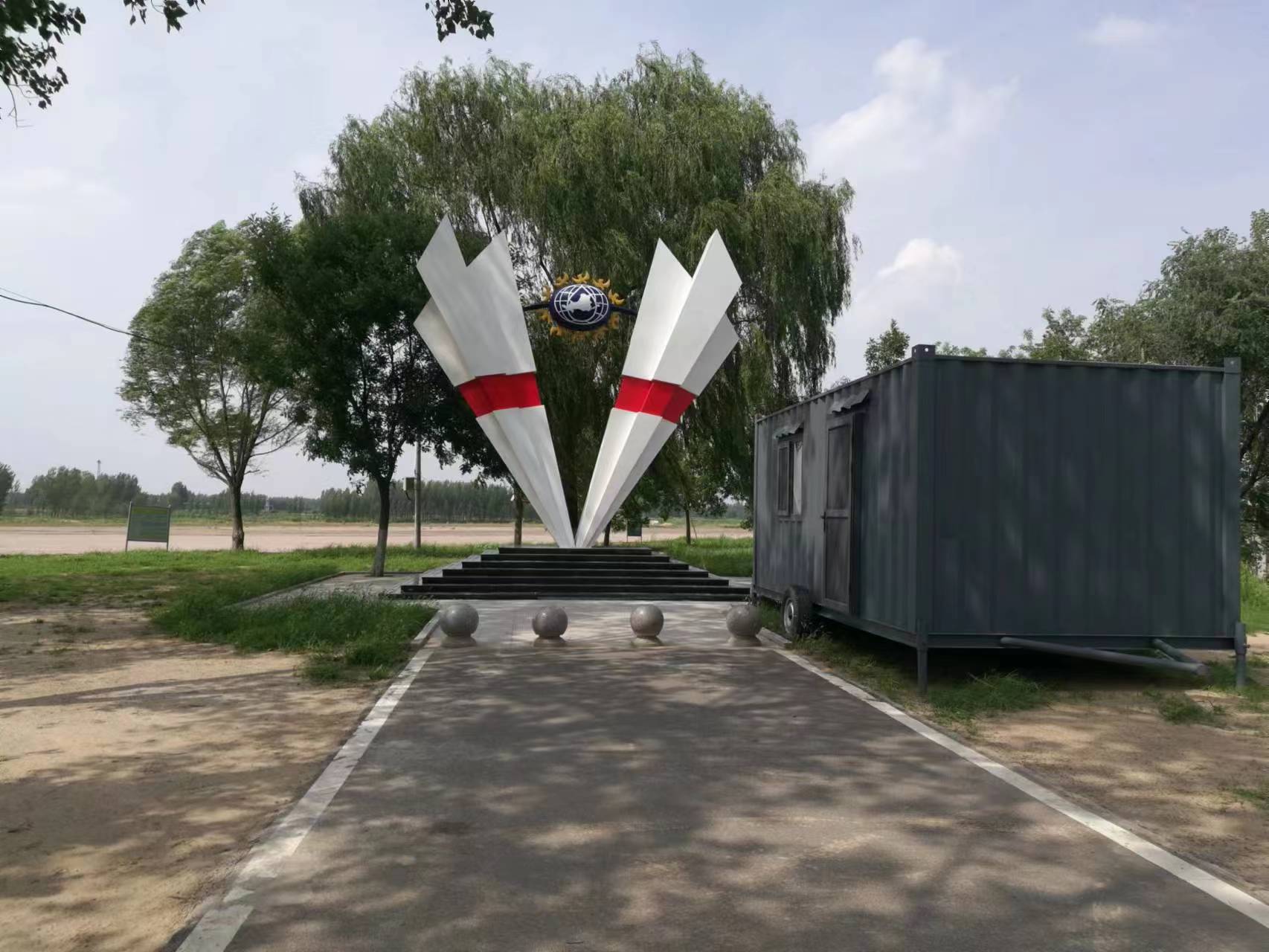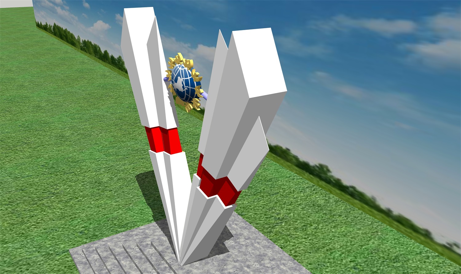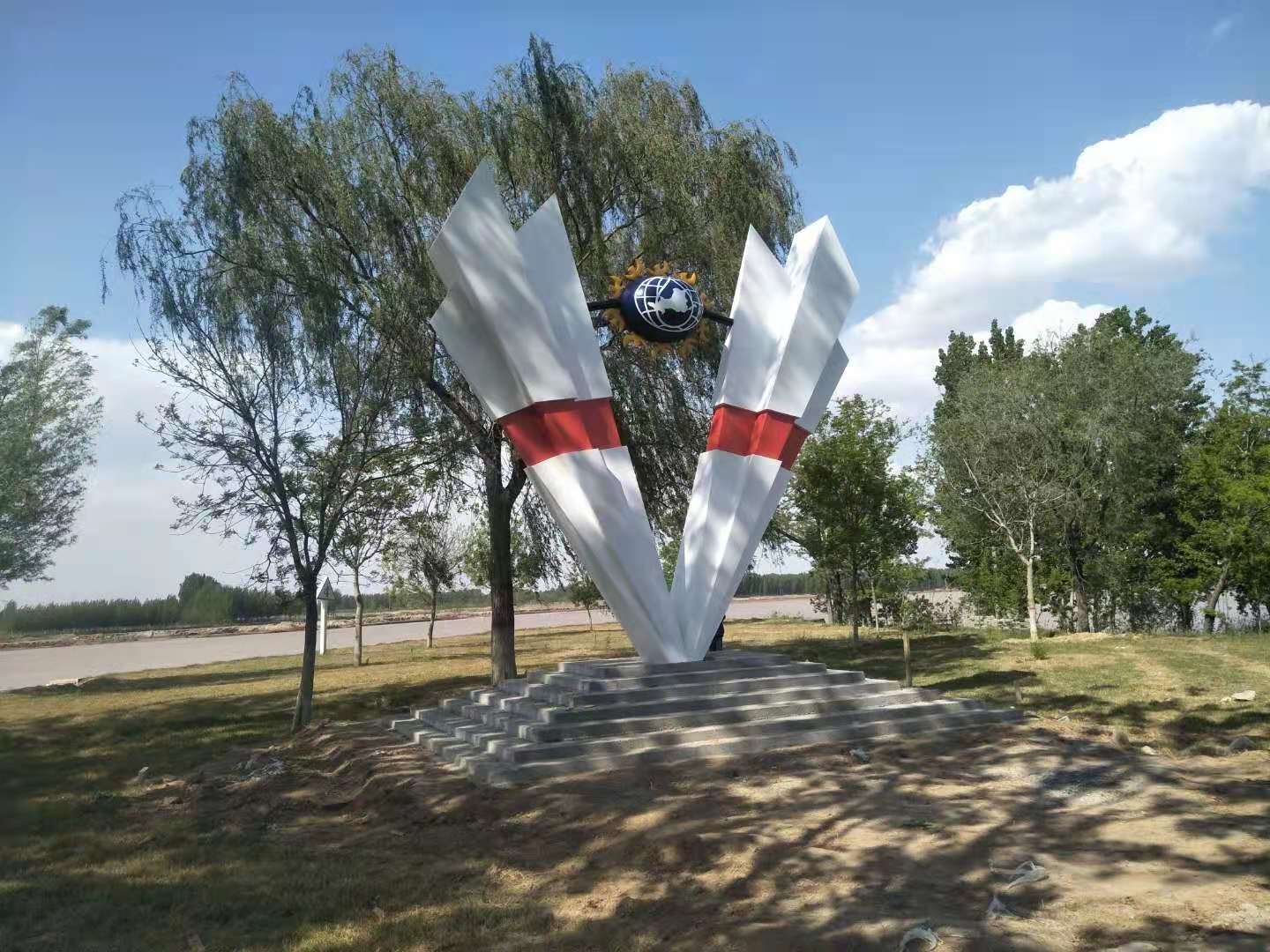 雕塑整體呈扇形構(gòu)造,代表黃河三角洲扇形外貌;兩側(cè)形似利劍,寓意治黃工作者敢于“亮劍”的拼搏精神; 中間球形,寓頂點(diǎn)之意;其上印制有黃河水利委員會(huì)標(biāo)志,圍繞十只和平鴿。寓意以治黃事業(yè)為中心、人民幸福、和平安寧、生態(tài)保護(hù)、空間均衡;主體色彩以紅、黃、藍(lán)搭配。紅色代表黨建引領(lǐng),黃、藍(lán)象征海河交匯。寓意治黃事業(yè)在中國(guó)共產(chǎn)領(lǐng)導(dǎo)下開創(chuàng)新篇章。
