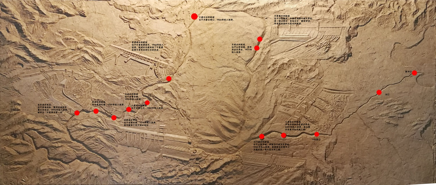 小浪底上游河段:按照地理位置將三門峽、龍羊峽、小浪底、萬家寨、劉家峽、青銅峽點(diǎn)綴其上(浮雕加簡(jiǎn)介)。其余水利樞紐僅標(biāo)注位置以及投入使用時(shí)間。