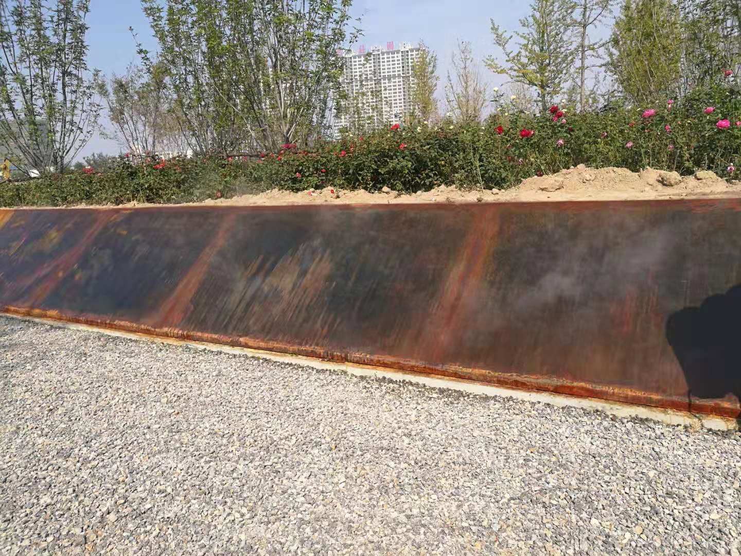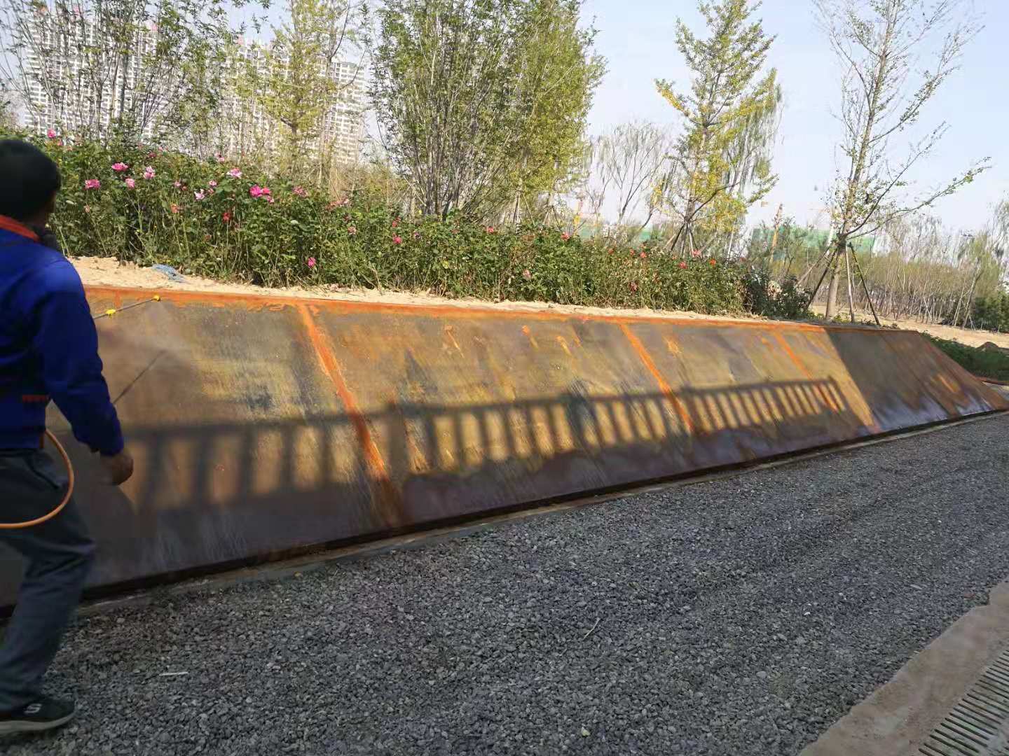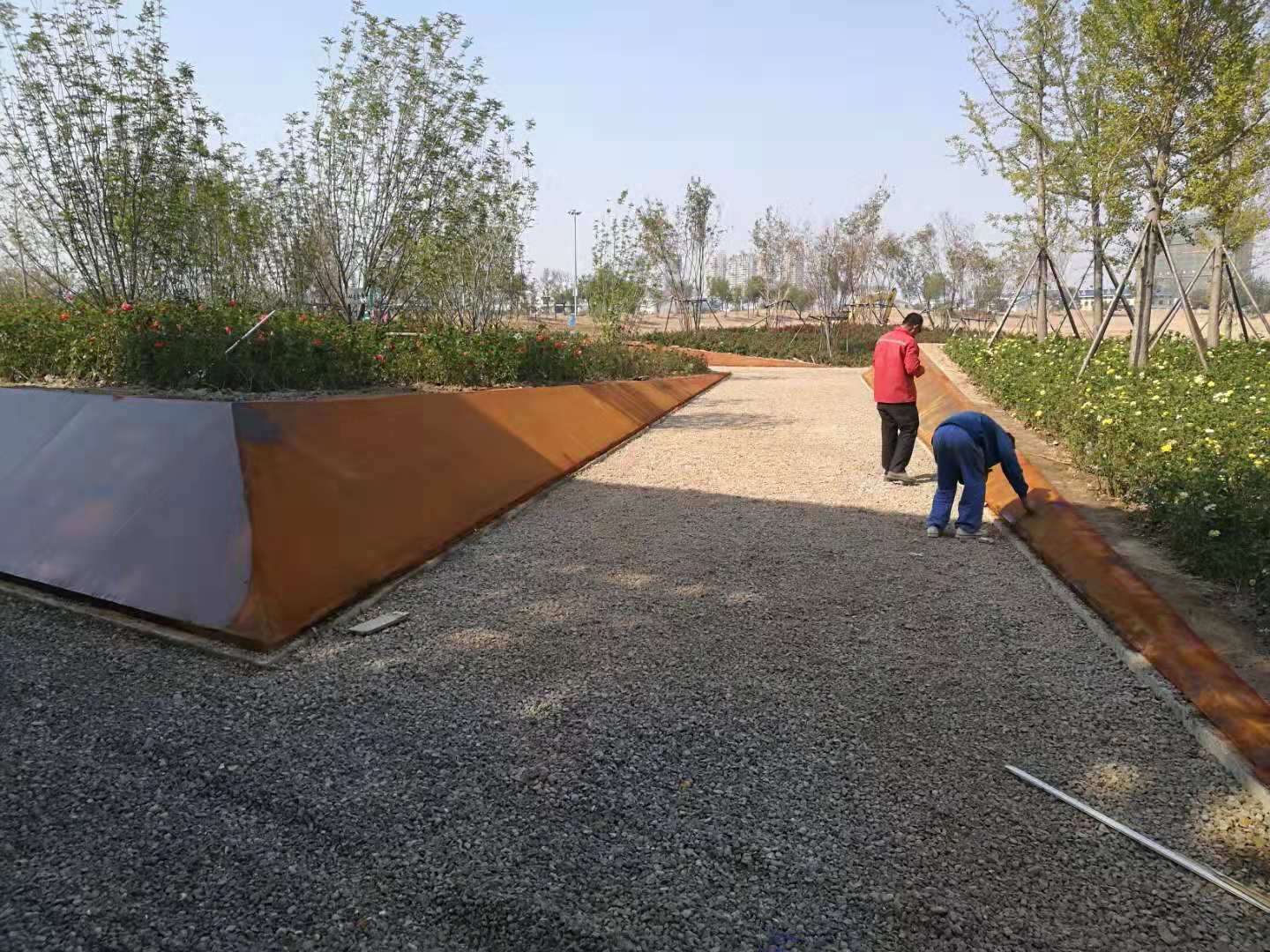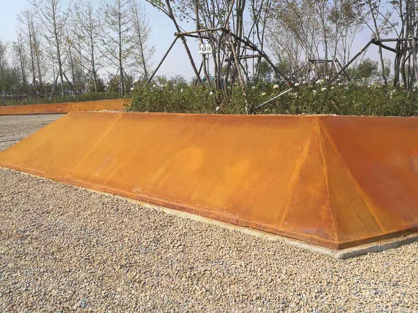中海植物園即原來的中海景區(qū)東北角的原高爾夫球場區(qū)域,2018年改造升級為濱州中海植物園。所施工的銹板花池共7組,造型表面積共488平方米。造型板采用5mm厚銹板,支撐采用80mm*50mm*2.5mm的U形鋼。采用專業(yè)的耐候鋼生銹劑及固銹劑做表面處理。生銹的初期會呈黃色,然后隨著生銹進程的推移,逐漸顯現(xiàn)金黃色,橙黃色,橙色,橙紅,紅褐色最后在紅褐,或者褐色穩(wěn)定下來。